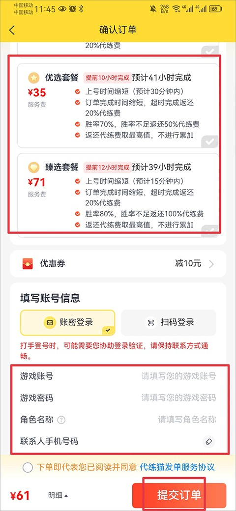 4、最后,在确认订单的页面中挑选好套餐,填写完整的账号信息后,点击提交订单并完成支付即可。
