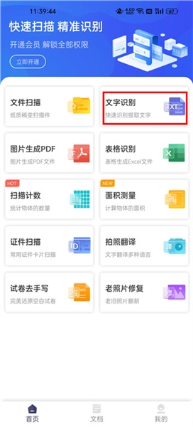 打开软件后,能看到它的功能十分多样,包含文件扫描、文字识别、图片转PDF、表格识别、试卷去手写、拍照翻译等,下面我就以文字识别功能为例来介绍
