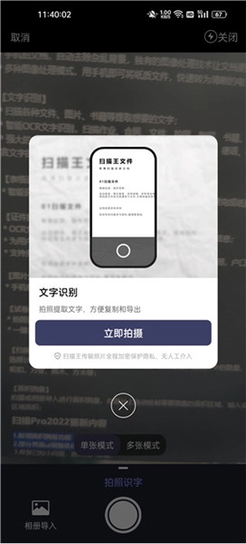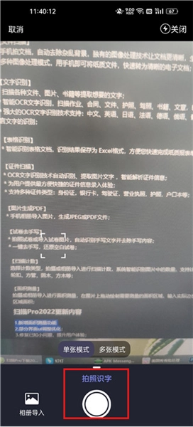从图中能够看到,拍照识字具备单张模式与多张模式这两种选择,接下来小编就以单张模式为例进行说明。