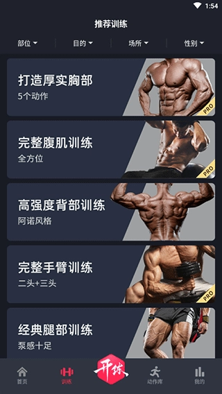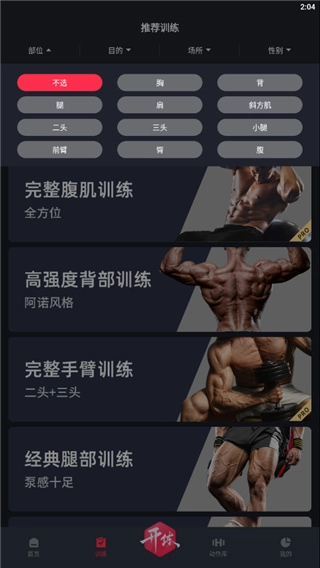 点击进入“训练”板块,这里提供手臂、腿部、腹肌等多部位的全方位训练教学。