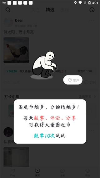 围观币数量越多,能分到的挑战金就越多,每天最多可以进行十次鼓掌操作。
