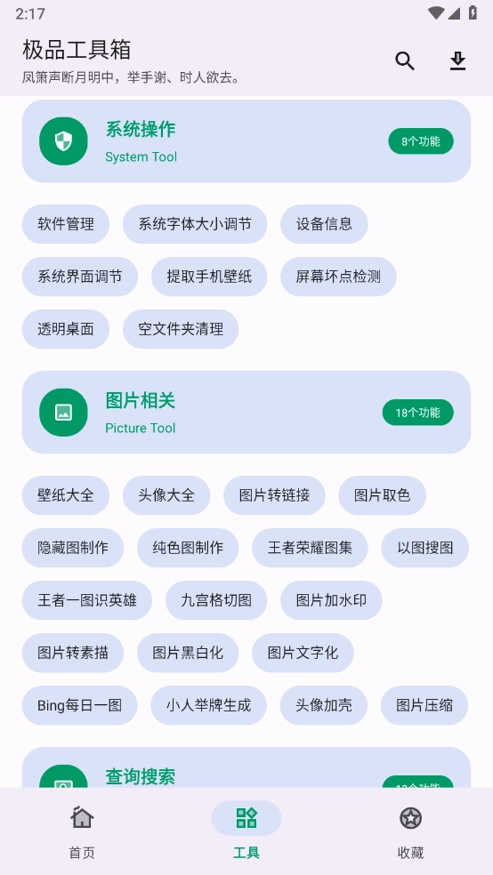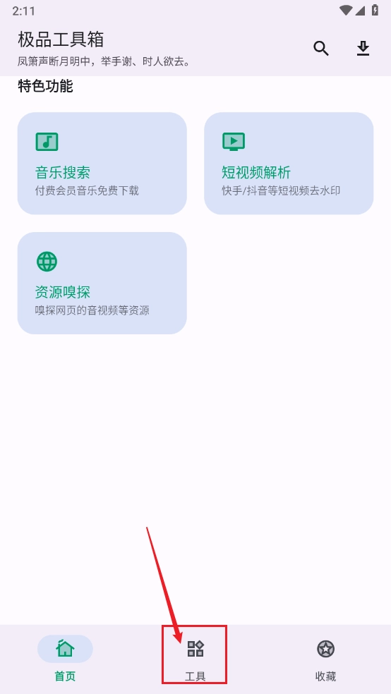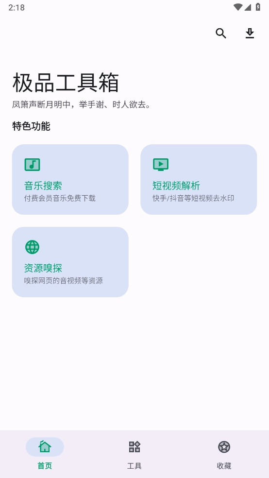 极品工具箱是一款集成了多种实用功能的手机工具箱,所有功能都免费开放,无需付费,只需在里面一键点击就能使用。它不仅包含音乐搜索和免费服务,还拥有资源探测、短视频解析等功能,并且支持一键添加到收藏夹。