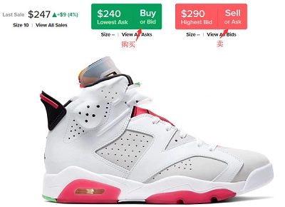 注册完成后,找到你需要的鞋款,打开后就是这个页面。从这里开始要划重点了!!!选好尺码,这里显示的都是美码。绿色按钮代表“买”,红色按钮代表“卖”。我们通常购买球鞋时,点击绿色的框即可。
