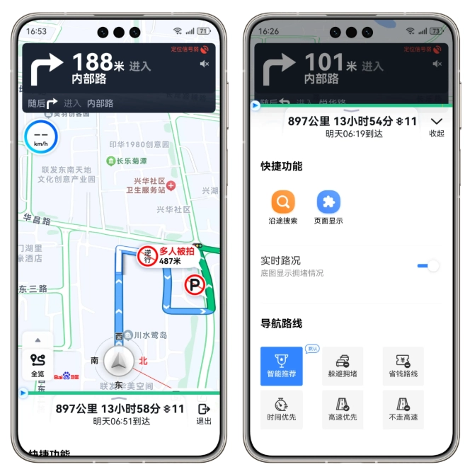导航开启后,从页面底部向上滑动,即可看到多个智能规划的路线方案,可根据实际需求自由选择。