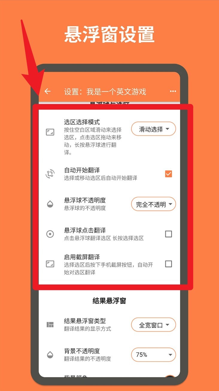 进入“悬浮窗设置”页面后,能够对悬浮球的行为进行调整,比如设置是否开启自动翻译、点击触发翻译、启动截图翻译等个性化功能。