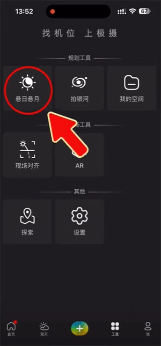 若想查看超级月亮的月亮轨迹,可打开极摄,进入工具页面后点击下图红色功能区。
