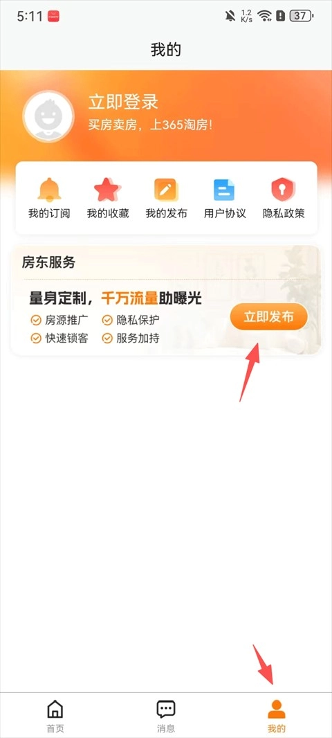 打开365淘房App,登录账号后,找到“我的”页面并点击“立即发布”按钮。
