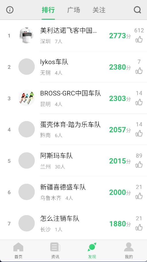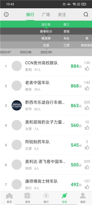 骑行赛事积分构成全国排行榜,一目了然。