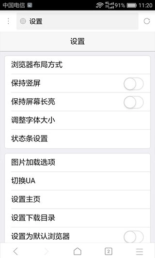 在设置界面里,我们能够调整浏览器的布局样式、锁定竖屏显示、开启屏幕常亮、修改字体大小,还能切换UA标识、自定义主页等。UC浏览器具备的功能这里几乎一应俱全,而一些UC没有的功能,X浏览器也照样拥有。