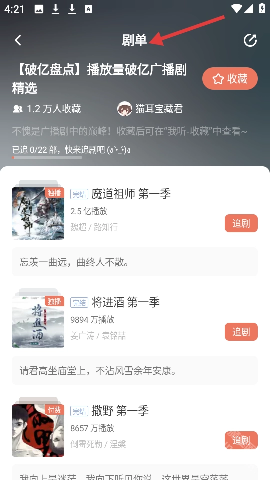 剧单页面展示播放量破亿的广播剧盘点精选,标注各作品的播放量和声优信息,支持收藏与追剧功能。