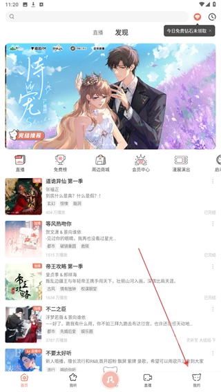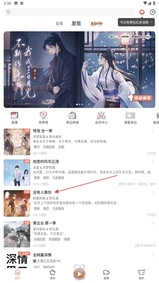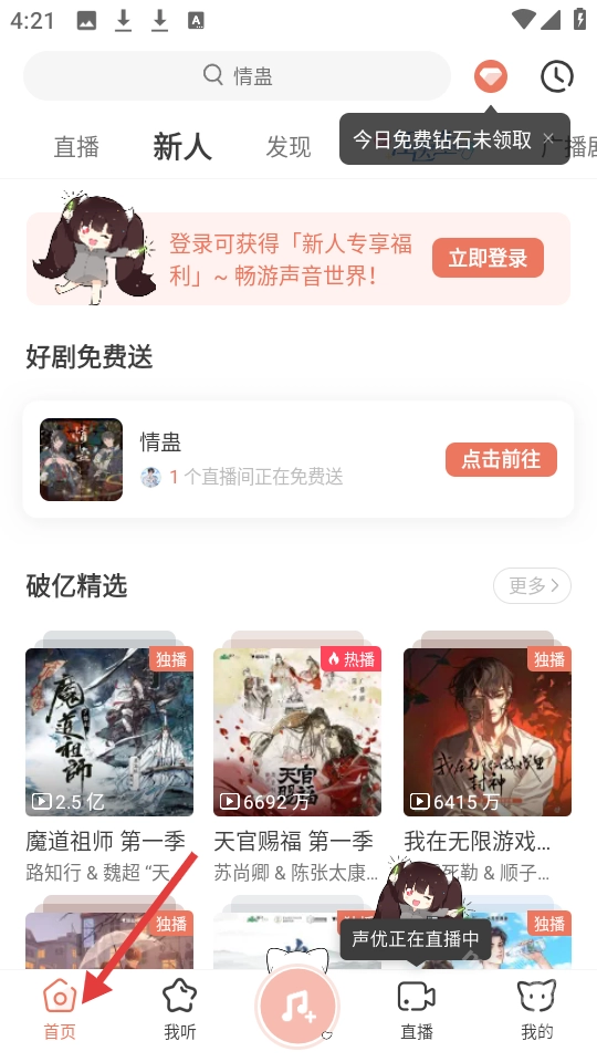 首页设有搜索栏,以及直播和新人板块,提示用户领取免费钻石与新人福利,还展示了好剧免费送和破亿精选广播剧的内容。