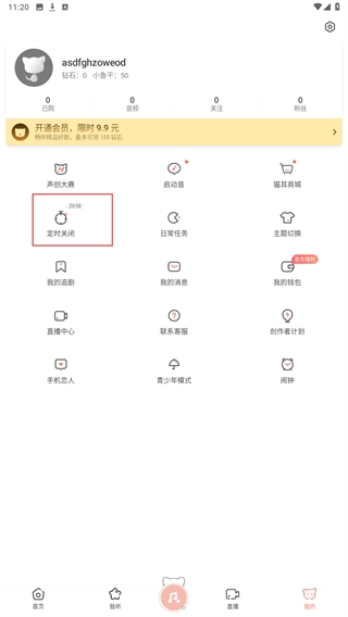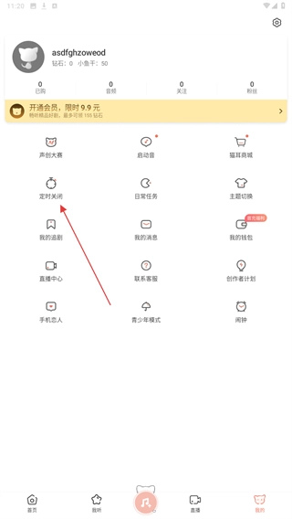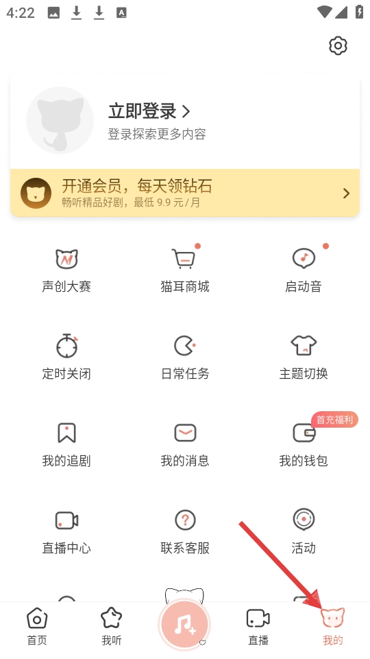 我的页面在未登录状态下会推荐会员每日领钻权益,同时集成了声创大赛、商城等功能,还包含定时关闭等个人设置选项。