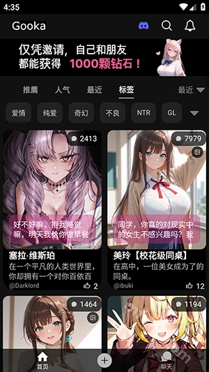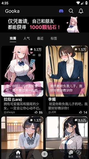 gooka最新版本推出了邀请好友免费获取1000钻石的活动,这些钻石可用于解锁更多角色和聊天模式,像深受大家喜爱的辛辣模式,它比正常模式内容更丰富、玩法更有趣!
