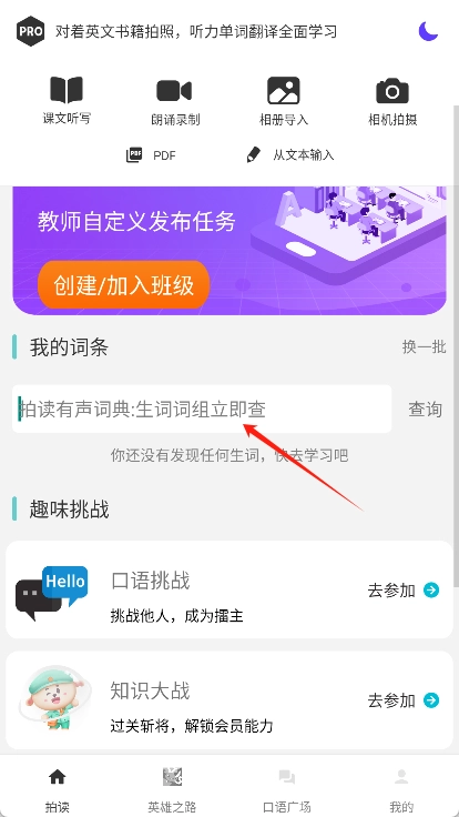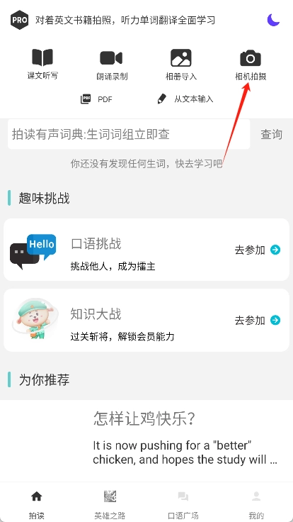打开拍读英语应用,点击界面上的“相机拍摄”功能,对准需要识别的英语文章或课本进行拍摄。
