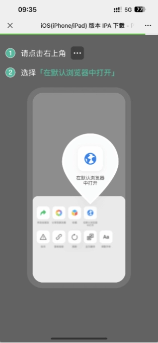 如果您是在微信、钉钉、支付宝这类应用里打开安装页面,这些应用自带的浏览器是没办法直接完成安装操作的。请您依照下面的步骤,在Safari浏览器中打开该安装页面: