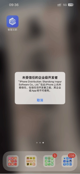 安装完成后,打开应用时可能会弹出未受信任的企业级开发者提示,您需要手动信任对应的企业级证书。该操作仅需执行一次,具体步骤如下: