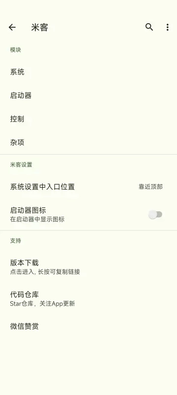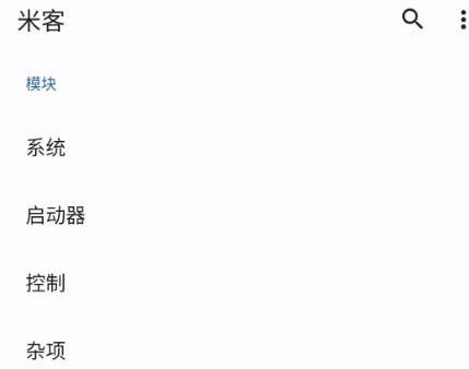 安装并打开米客后,其模块功能包含系统、启动器、控制、杂项等类别,若想使用某个功能,直接点击对应的模块进入操作即可。
