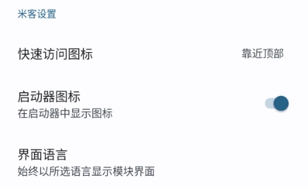 在米客的设置界面,能够对启动器图标、界面语言以及快速访问图标等进行设置。