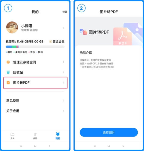 除了相册PPT图片能自动转为PDF外,您还可以手动进行图片转PDF操作。具体步骤是:进入云盘的“我的”页面,找到“图片转PDF”功能,然后选择手机相册里的图片,就能将其转为PDF了。
