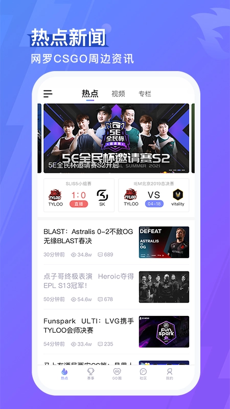 5eplay是一款专门面向电竞玩家的游戏辅助工具,玩csgo就选5eplay准没错。5eplay手机端不仅汇集了丰富的游戏赛事资讯,还包含了玩家们热衷的GO圈内容。在社区里,你能和各路游戏大神交流切磋;闲暇时,也可以浏览热点新闻,掌握游戏周边的最新动态。感兴趣的朋友可别错过啦。