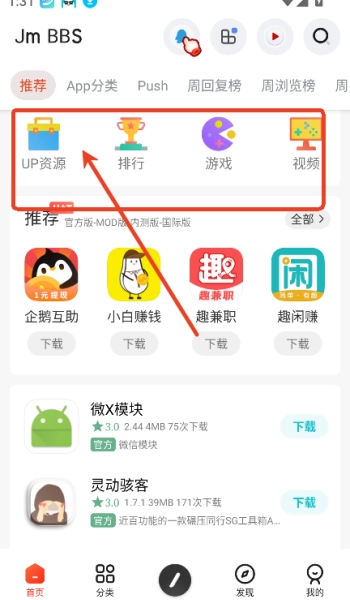 打开芥末空间的首页,能看到up资源、游戏、排行、视频等诸多板块。