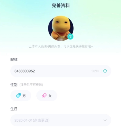 登录后填写头像、昵称、性别、生日及标签等资料。