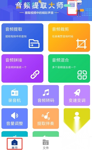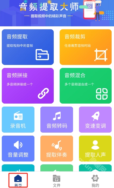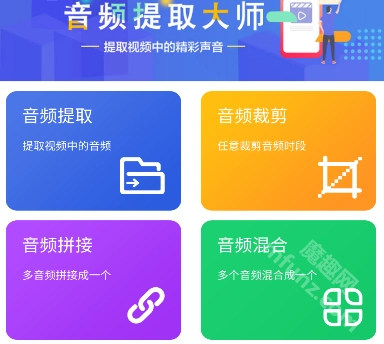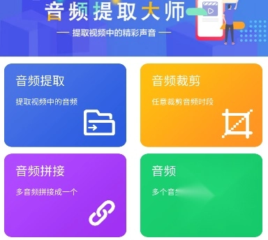 音频提取大师的首页上,设有音频提取、音频裁剪、音频拼接、音频混合、录音机以及音频转码等多种功能。