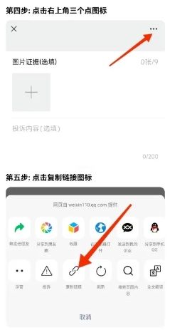 进入投诉页面后,在页面右上角找到三个点的图标,点击该图标后选择“复制链接”选项。
