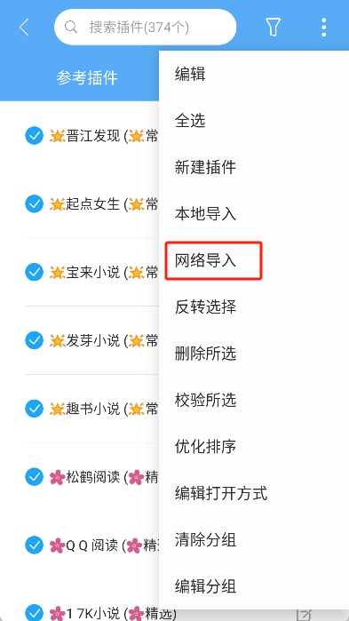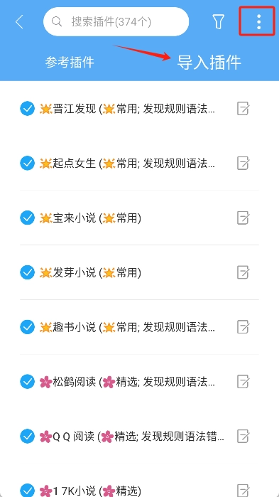在插件页面里找到“导入插件”选项并选中,接着点击右上角的更多功能图标。