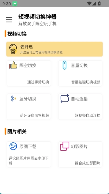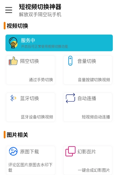 短视频切换神器是一款短视频切换辅助工具,其工作原理是借助安卓无障碍服务,对蓝牙耳机指令进行监听,进而模拟视频切换操作,使耳机成为遥控器,帮助用户解放双手,实现隔空操控手机。用户只需开启相关功能,就能正常使用视频切换服务。该神器具备隔空切换、音量切换、蓝牙切换和自动连接等多种功能。