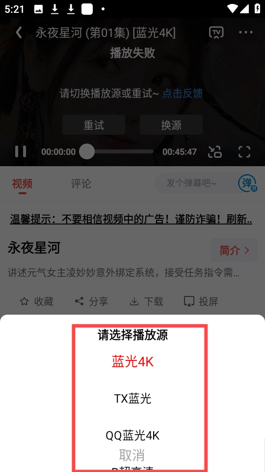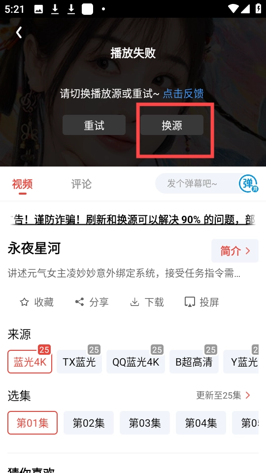 从提供的多个播放源中选择一个新的源,参考示意图。