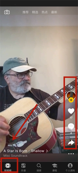 进入应用后会直接跳转到短视频页面,在这个页面里能看到其他用户发布的弹奏视频,你可以对视频进行点赞、分享操作,还能在评论区和其他用户互动交流。