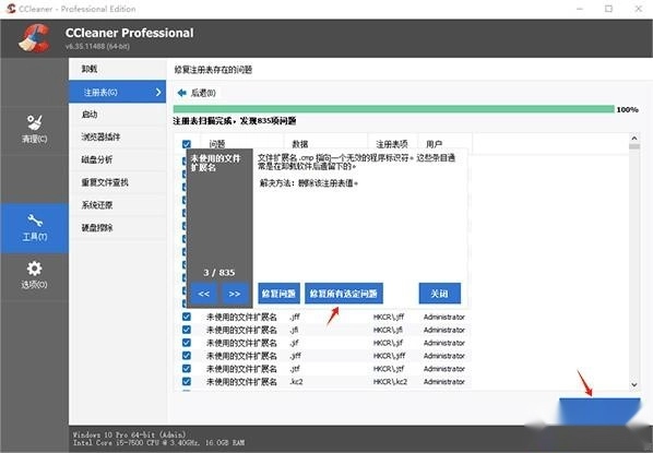 扫描完成, 点击"修复所有选定问题"-"清理";