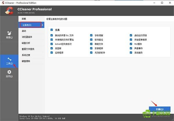 点击“工具”选项,再选择“注册表”,接着挑选需要检查的项目,之后点击下方的“扫描”按钮即可。