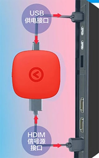 用HDMI线把电视和天猫魔投连接起来,USB电源线可以插在电视的USB接口上(这样电视机和魔投就能同步开关机),也可以用手机充电器来供电。