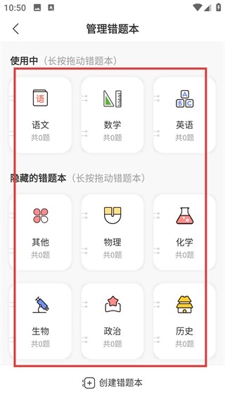 在错题本管理界面,你可以看到“使用中”和“隐藏”的错题本分类,长按分类即可拖动调整顺序,同时也支持创建新的错题本。