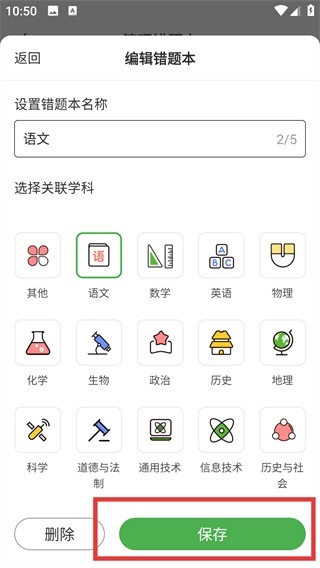 点击目标错题本进入编辑界面,修改名称并选择关联学科后,点击【保存】按钮,即可完成错题本的编辑操作。