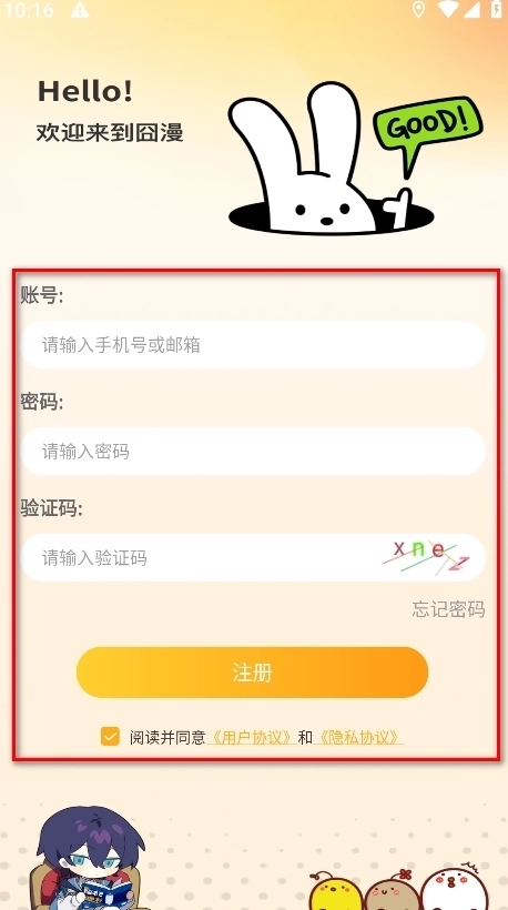 4.请输入手机号码/邮箱、密码、验证码,勾选阅读并同意《用户协议》和《隐私协议》,再点击注册即可。
