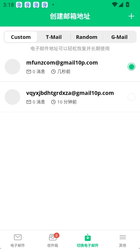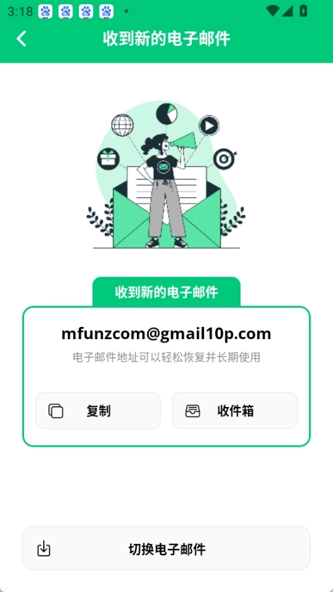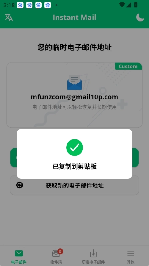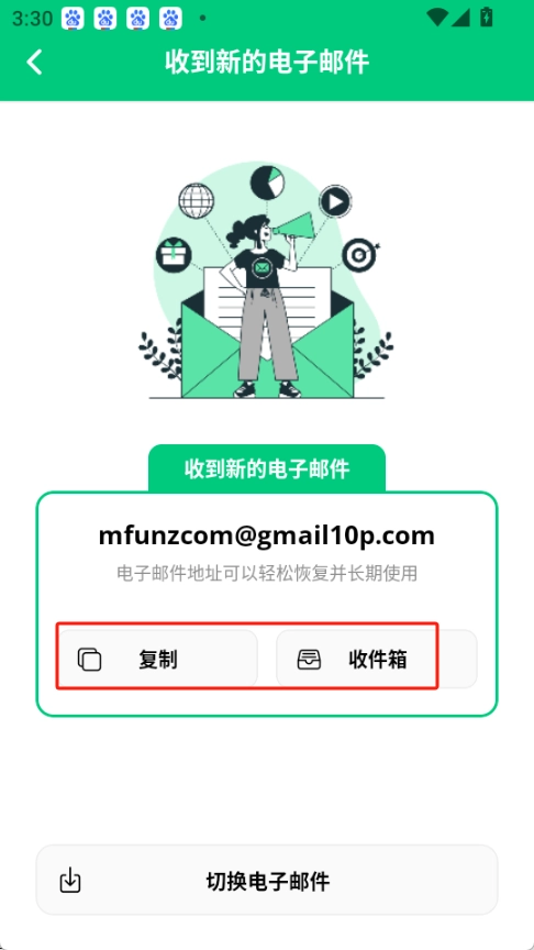 新的临时邮箱已成功获取,您可以直接复制该邮箱地址,也可点击进入收件箱(此电子邮件地址支持轻松恢复且能长期使用)。