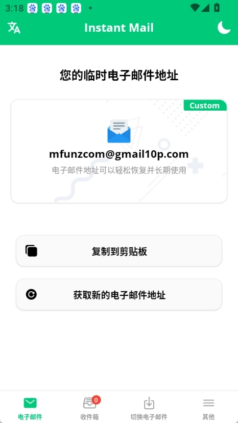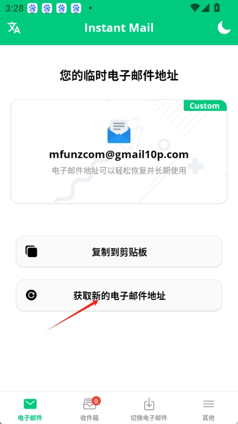 在手机上安装并打开临时邮箱InstantMail,接着按照下图所示,点击获取您的电子邮件地址。