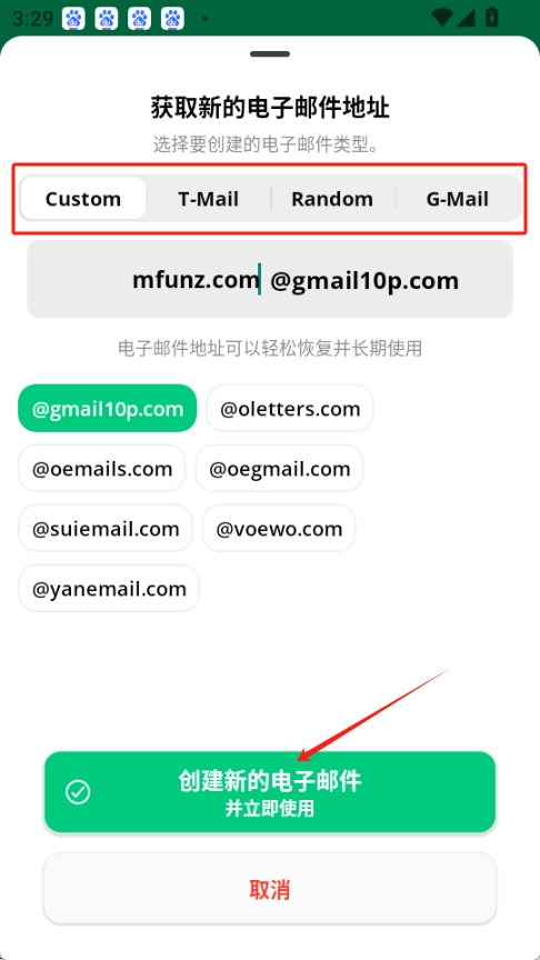 然后选择你想要获取的电子邮件类型,接着输入用户名,点击创建该电子邮件并立即使用它