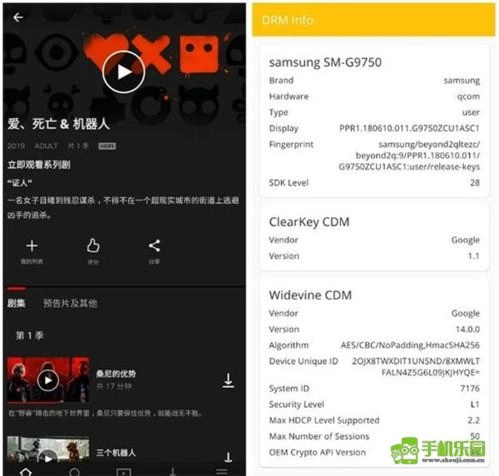 这边就拿小编的手机来给大家举个例子,我用的是三星S10,它本身是支持HDR的。虽然我自己不支持杜比音效,但好在手机自带了杜比音效功能,刚好补足了这个短板。另外,在DRM INFO里查看的话,我的设备安全等级是L1,这意味着我能观看最高清晰度的视频内容。