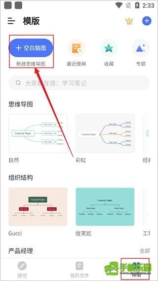 打开Processon软件后,在【模板】板块里找到并选择【空白脑图/新建思维导图】。