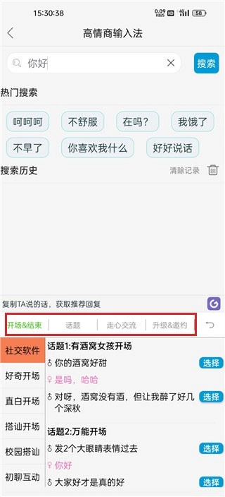 像图中展示的这样,就是输入法的界面啦,它不仅能和普通输入法一样正常使用,还提供了各类开场语和话题供大家便捷挑选。