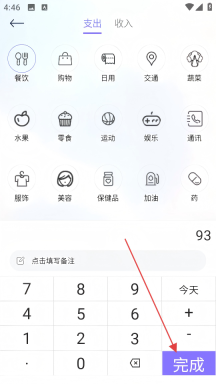 3、在支出分类选择界面选择消费类别,输入消费金额后点击【完成】。