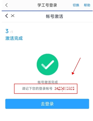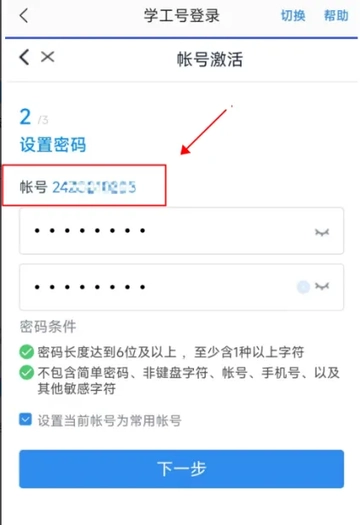 请务必记住下图所示位置的账号(该账号即本人学号,在登录等多种场景中都会用到,一定要记牢)。接着设置个人登录密码,设置完成后点击“下一步”按钮。