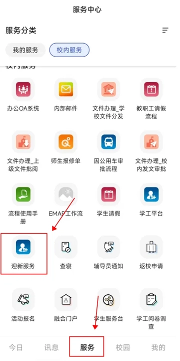 登录后点击“服务”,如图所示,点击后可选择“迎新服务”,进入迎新系统完成线上报到等业务办理。(图片日期仅作功能说明,具体日期请以学校通知为准)