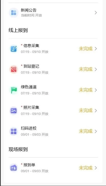 完成线上报到流程后,前往院系现场报到时,请在“今日校园”里展示个人二维码与身份证,由负责老师扫码完成登记。扫码登记结束后,现场报到环节的状态将显示为绿色对勾。