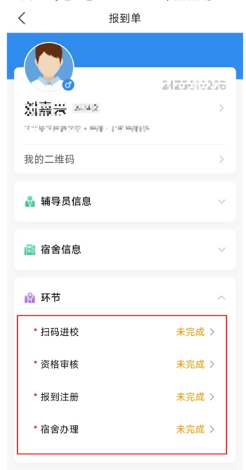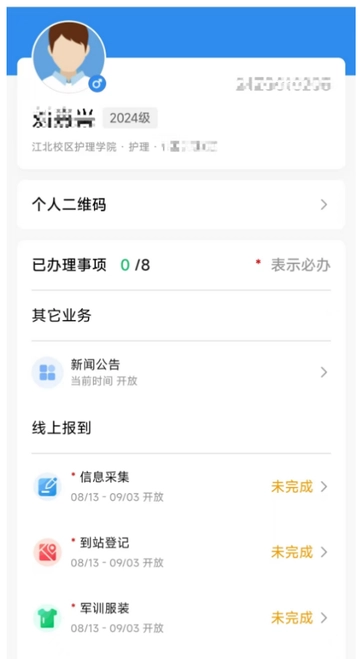 进入“迎新服务”后,会呈现出如下界面。界面上的姓名、学号、学院等信息,是由招生数据自动同步而来的;个人二维码则是现场报到时需要用到的。新生要在现场报到之前,完成那些带有星号标记的必办线上报到环节。