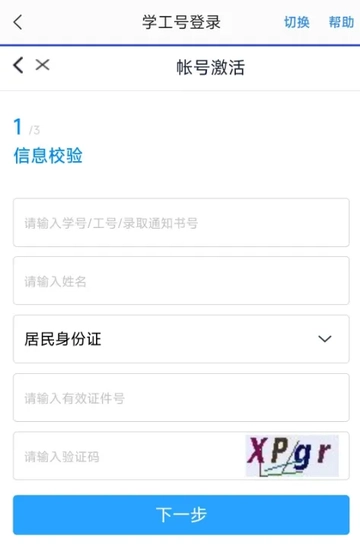 在账号激活页面填写录取通知书编号(位于通知书照片的下方位置)、本人姓名、身份证件号码以及验证码,之后点击“下一步”按钮。